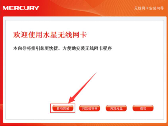 2. 将 mercury 无线网卡插入电脑的USB接口,开始进入 mercury 无线网卡驱动的安装界面,点击左下方的“自动安装”按钮。