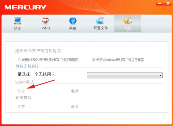 4. 接着用户需要切换到 mercury 无线网卡驱动的“高级”选项,并将里面的“SoftAP”选项勾选“开”。