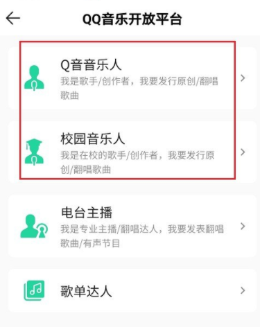 进入 QQ 音乐 开放平台,如图,你可以点击选择”Q音音乐人”或者”校园音乐人”,认证歌手,