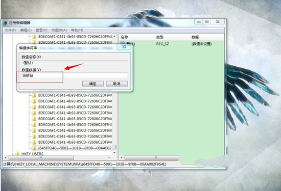 修改之后,出现如下界面,在出现的“数值名称”中,将“{默认 }”修改为“{回收站}”,然后点击确定。
