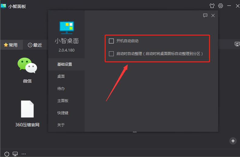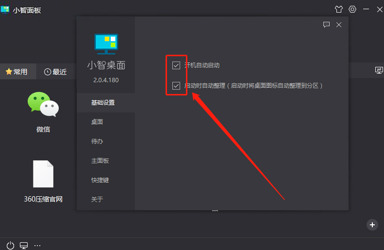 4. 所以,将“开机自动启动”和“启动时自动整理”这两项内容勾选,再将设置界面关闭。最后将电脑重启便会发现小智桌面已成功设置开机自启。
