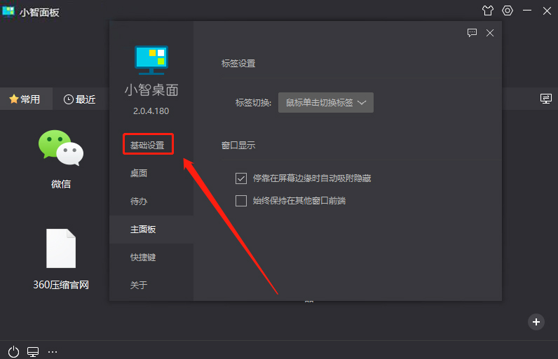 2. 然后,在小智桌面的设置界面中,点击“基础设置”,从而打开开机自启的设置界面。