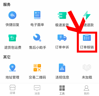 4. 接下来,就可以开始使用拼多多商家工作台提供的订单核销功能。用户进入拼多多商家版APP,在其向导页面中,点击服务菜单中的“订单核销”。