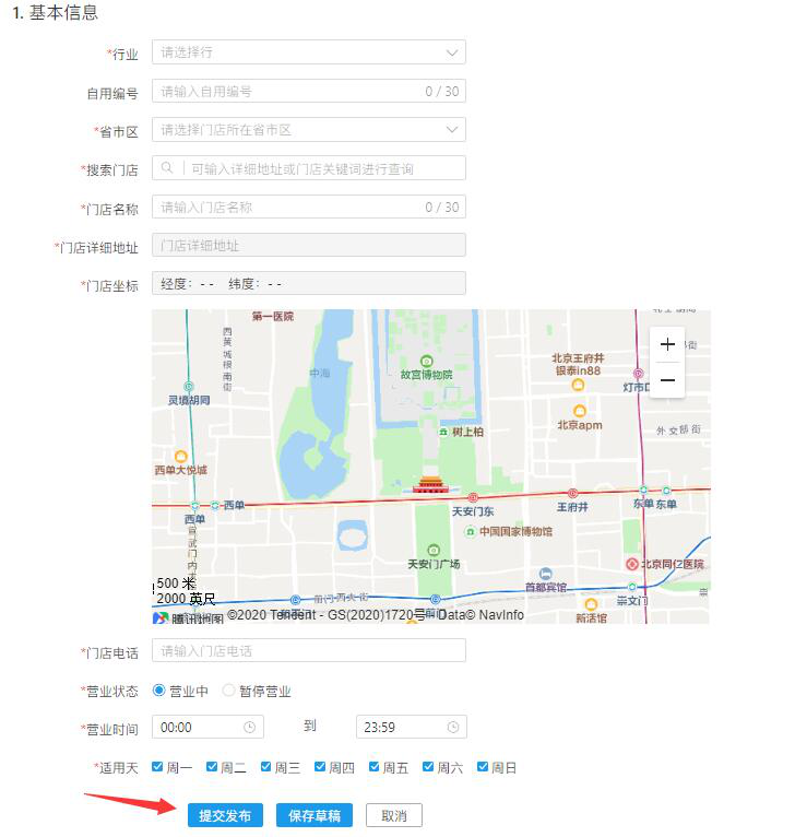 2. 然后,在创建门店的页面中,正确输入基本信息,再点击“提交发布”按钮。