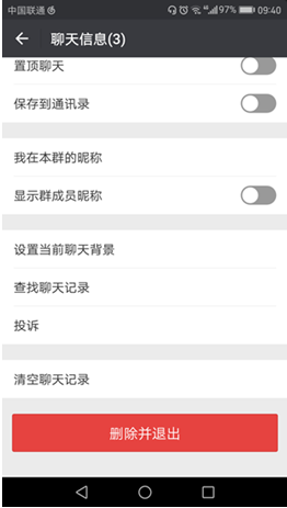 看到底部的删除并退出按钮,点击它,然后按提示选择确定删除即可彻底解散微信群了,如图所示