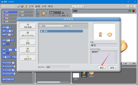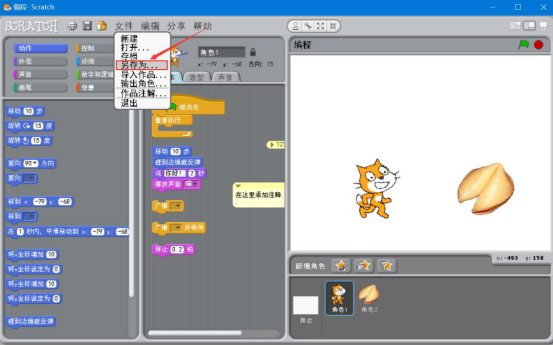 1. 首先,我们在scratch中完成自己的作品,再点击“文件”菜单中的“另存为”。