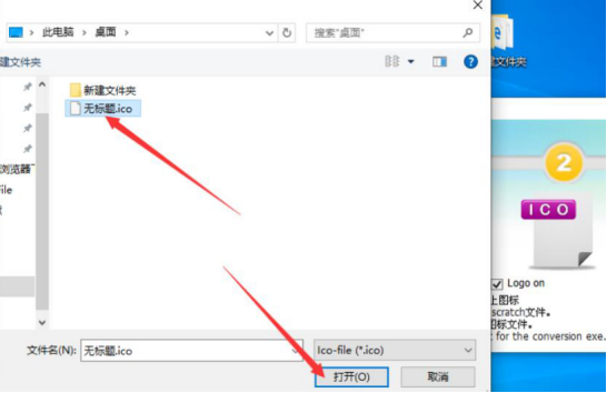 7. 接着,我们点击stratch2exe的第②步。弹出打开窗口,选择准备生成可执行文件的“*.ico”图标,点击“打开”按钮。如果没有该图标文件的话,就可以利用画图工具自己简单制作一个。