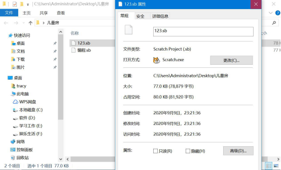 3. scratch将作品另存后,我们右键单击该作品文件,在其属性窗口中,可以看到它的后缀是“*.sb”,可是这种格式并不支持在电脑上单独运行,我们需要将它更改为“*.exe”格式。