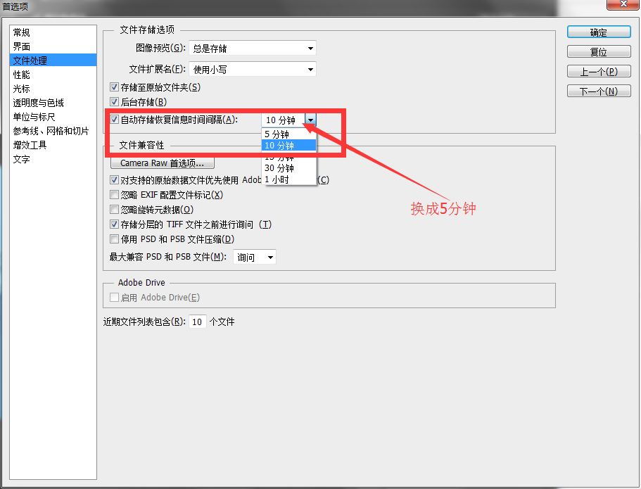 2. 完成第一步之后,会弹出一个对话框,将\"自动存储恢复信息时间间隔(A)\"的时间更换成5分钟,默认是 10 分钟。