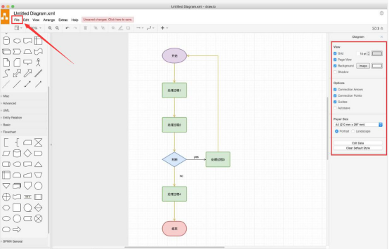 8. 最后,还可以应用右侧属性面板,设置图形、线条属性。完成流程图的绘制后,就点击 draw.io 菜单中的“File”将该流程图给保存起来。