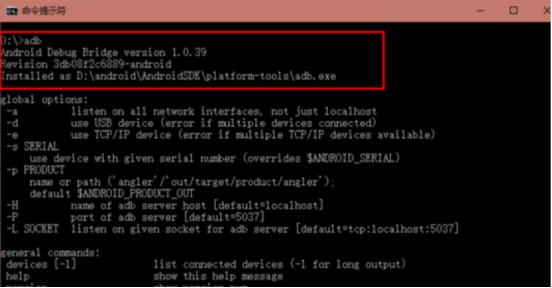 重新打开一个cmd窗口,输入adb,可以看到如下的窗口,有显示adb的版本和用法,这就说明adb正确安装好了。