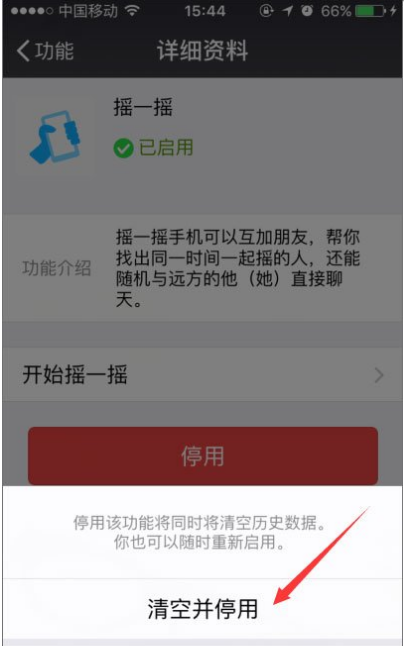 7. 这时会有提示,我们点击“清空并停用”,这样“摇一摇”功能就从我们的微信里面卸载掉了。