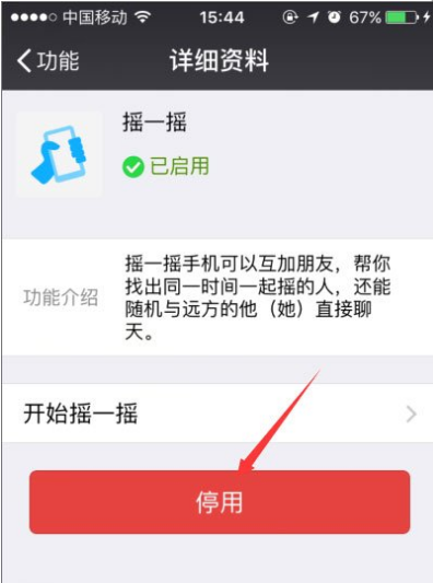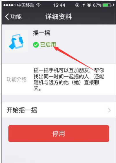 6. 进入“摇一摇”功能界面,我们点击“停用”按钮;