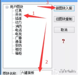 11. 在弹出界面点击“用户图块“,然后点击用户图块下的“开关“,图形名称选择“六建面板“,点击“新图块入库“,如下图: