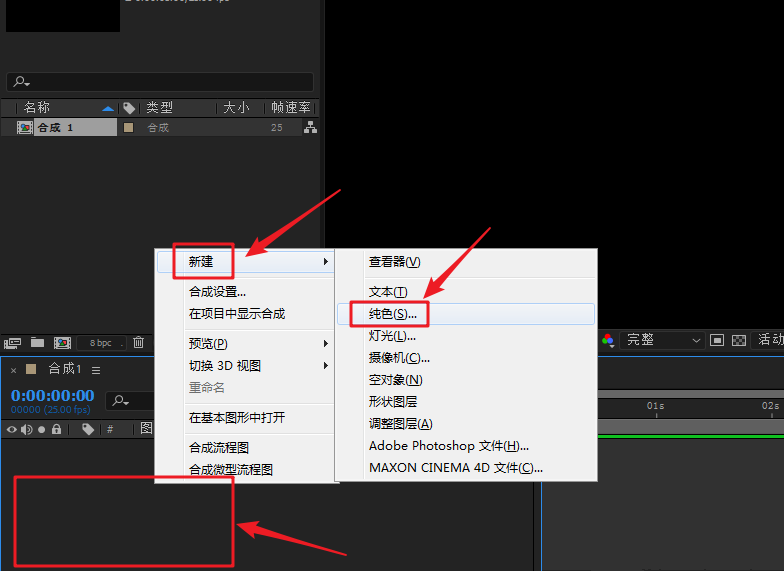 合成建立之后,再次点击时间面板,鼠标右键,选择“新建”——“纯色”图层,设置相关参数,