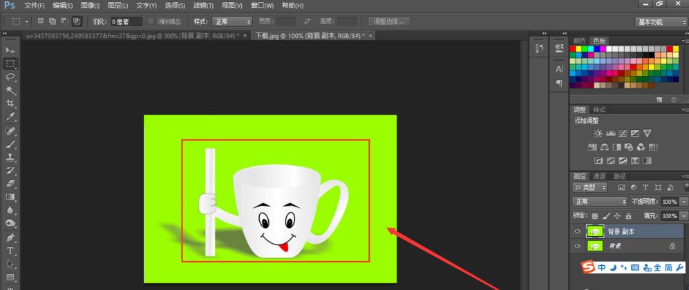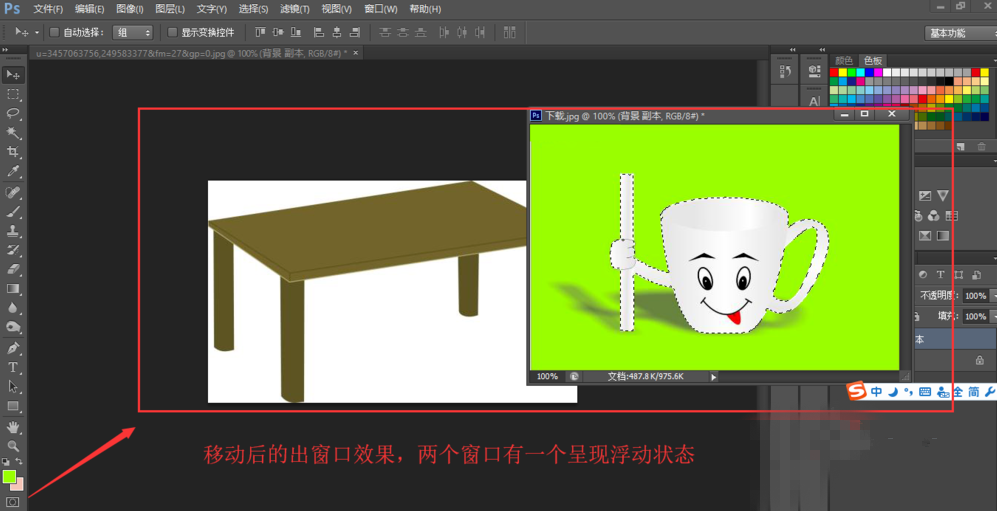 打开 PhotoShop ,把两张素材照放到 PS 软件里,我们为两个图片都复制一个背景层,然后在背景图层上准备把这个卡通杯子移动到这个卡通桌子上。这个操作完成后,我们即可明白在 PS 中应该怎么移动选好的区域。