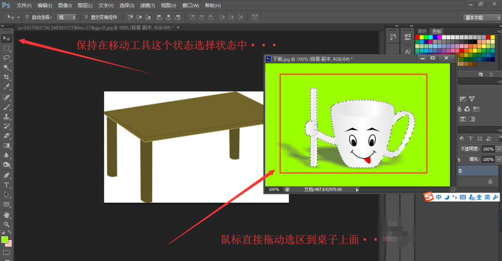 然后我们会处于移动工具状态,保持这个状态,不要选择其他的工具了。鼠标移动到我们杯子选区上面,开始移动选区,把这个卡通杯子移动到卡通桌子上面去,然后关闭卡通杯子那个图层,如图所示~