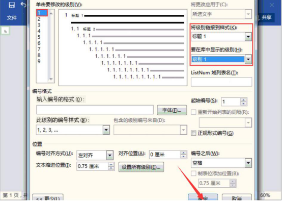 3. 此时,在弹窗中,选择级别“1”;而“将级别链接到样式”的下拉菜单中选择“标题 1”;“要在库中显示的级别”的下拉菜单中选择“级别 1”,再点击“确定”按钮。