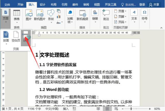 8. 接下来,我们将鼠标光标定位到 Word 文档的开头位置,再点击“插入”菜单中的“页面”,从页面下拉菜单中点击“分页”。