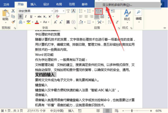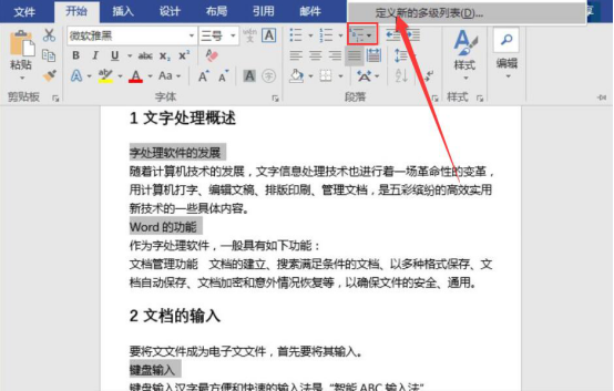 5. 同样的,我们将二级标题全部选中,再点击“开始”菜单中的“段落”,从中点击“多级列表”,并从其下拉菜单中点击“定义新的多级列表”。