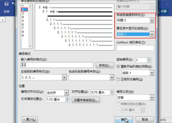 6. 在弹出的窗口中,将级别选择为“2”,而“将级别链接到样式”的下拉菜单中选择“标题 2”;“要在库中显示的级别”的下拉菜单中选择“级别 2”,再点击“确定”按钮。
