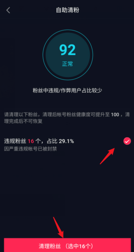 进入自助功能服务窗口,点击【自助清粉】,系统会自动检测违规或者作弊的粉丝,如图,勾选相关选项,点击【清理粉丝】,