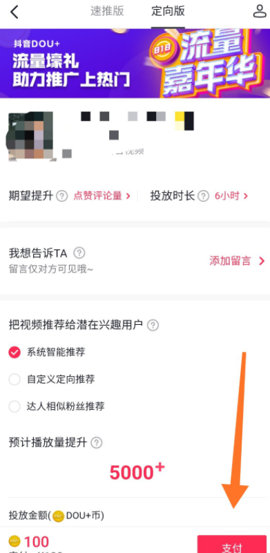 进入以下界面,点击“定向版“栏目,选择期望提升、视频推荐用户,然后点击“支付“,