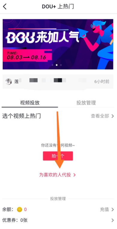进入“DOU+上热门“界面,点击“为喜欢的人代投“,然后选择抖音好友,