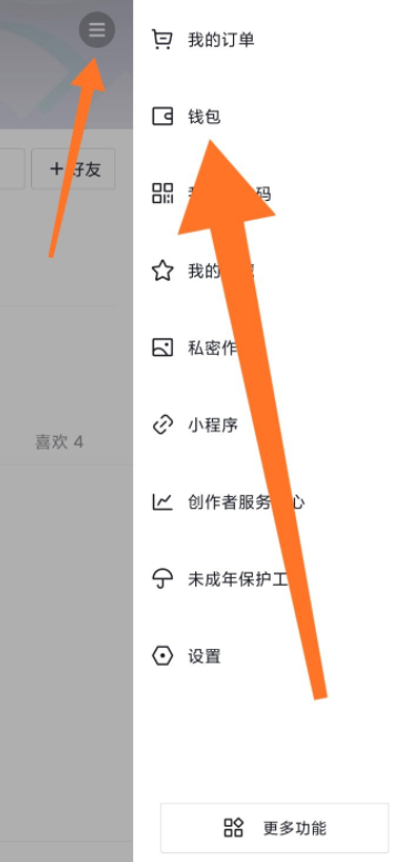 方法 2.打开抖音短视频,进入界面,点击“我“,然后点击主菜单,在侧边栏选择“钱包“,