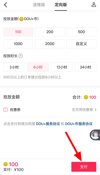 如图,选择投放金额、投放时长,点击“支付“,选择支付方式,最后点击“确认付款“即可。