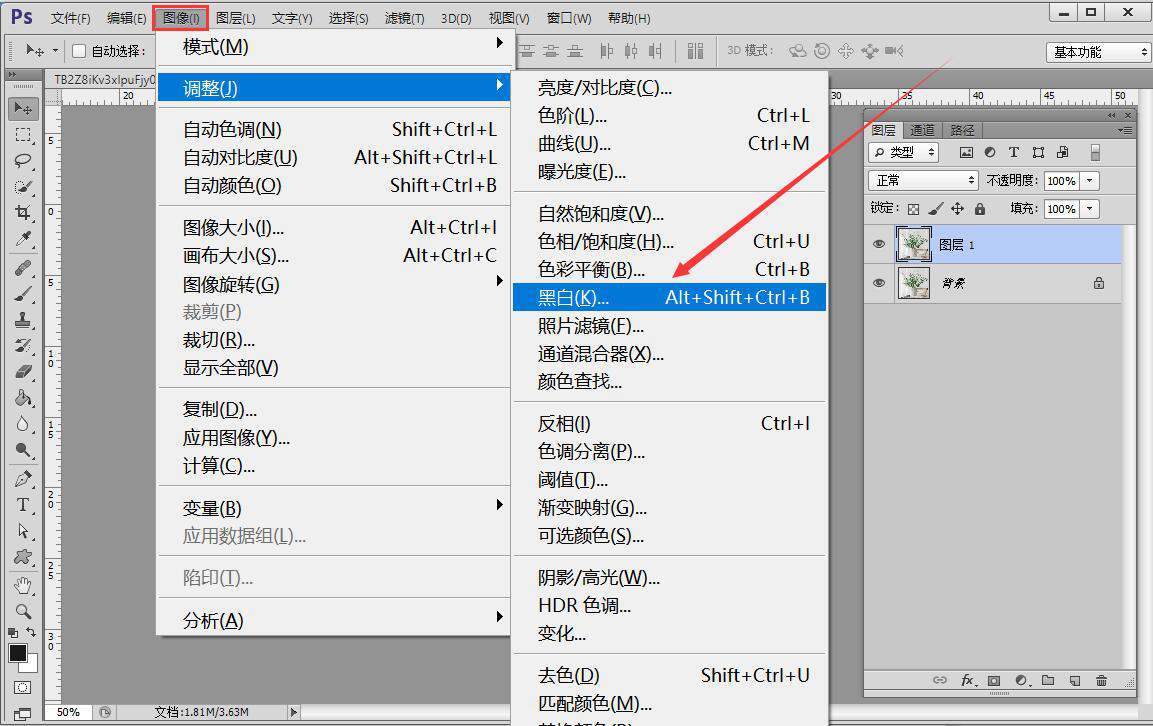 2. 先和大家讲解 PS 将彩色图片变成黑白图片的第一个方法,点击”图像”菜单中的”调整”,并从其子菜单中点击”黑白”。