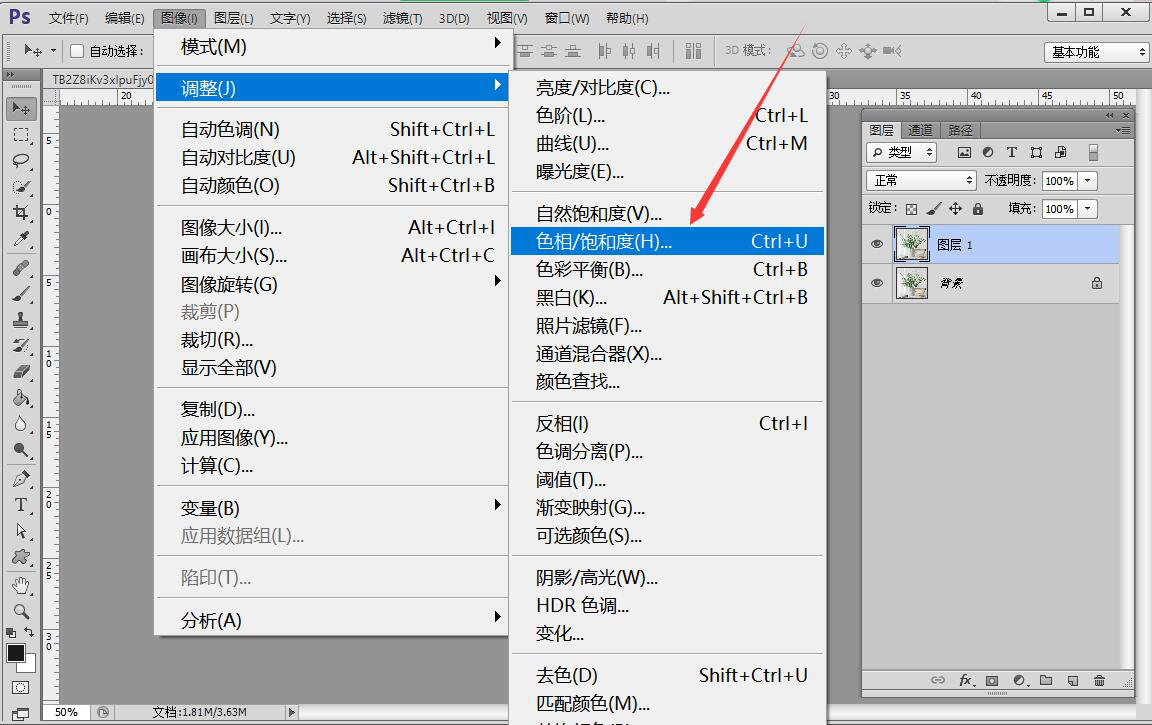 5. 再和大家分享 PS 将彩色图片变成黑白图片的第二种方法。点击”图像”菜单中的”调整”,并从其子菜单中点击”色相/饱和度”。