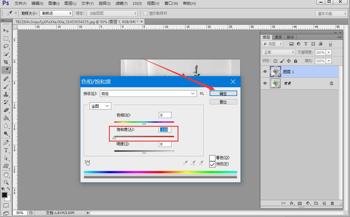 6. 此时, PS 便会弹出如下图窗口,我们将饱和度调整到最低值,再点击”确定”按钮。