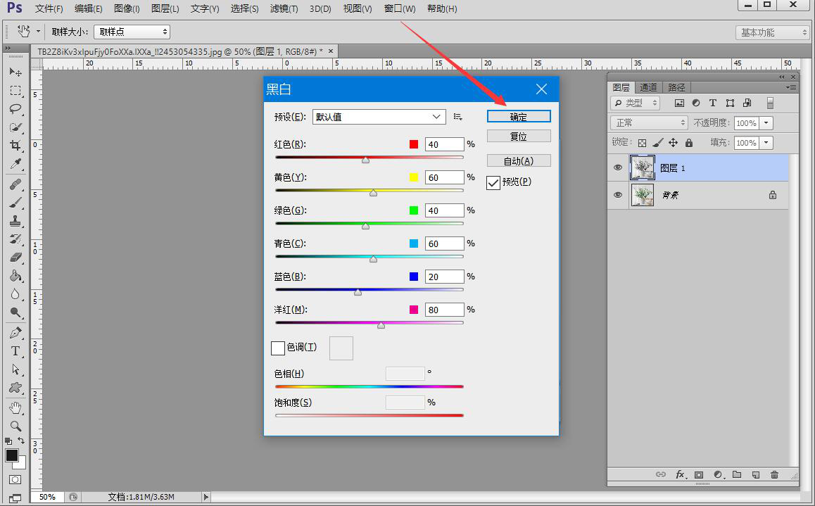 3. 弹出黑白设置窗口,我们可以根据自己想要的黑白效果来细微调整各种色调. 色相和饱和度,如果不需要调整,直接点击”确定”按钮。