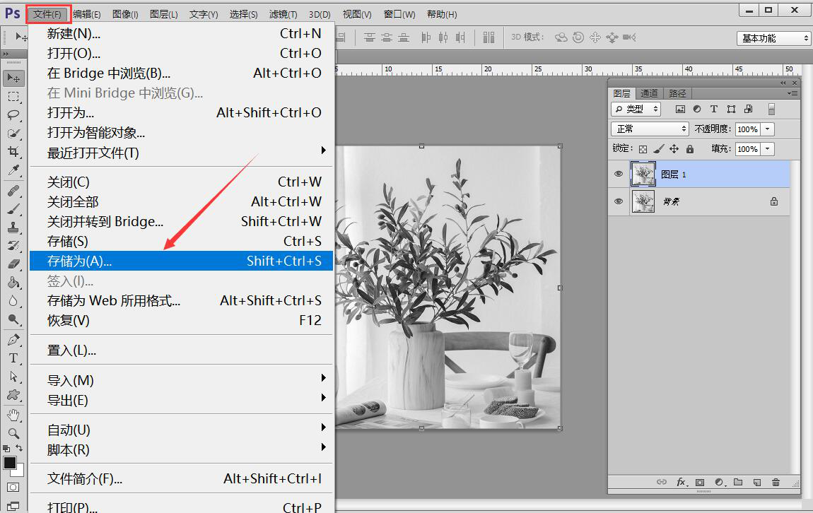 9. 最后,我们便可以看到彩色图片变成了黑白图片。点击”文件”菜单中的”存储为”选项将该图片给保存起来。