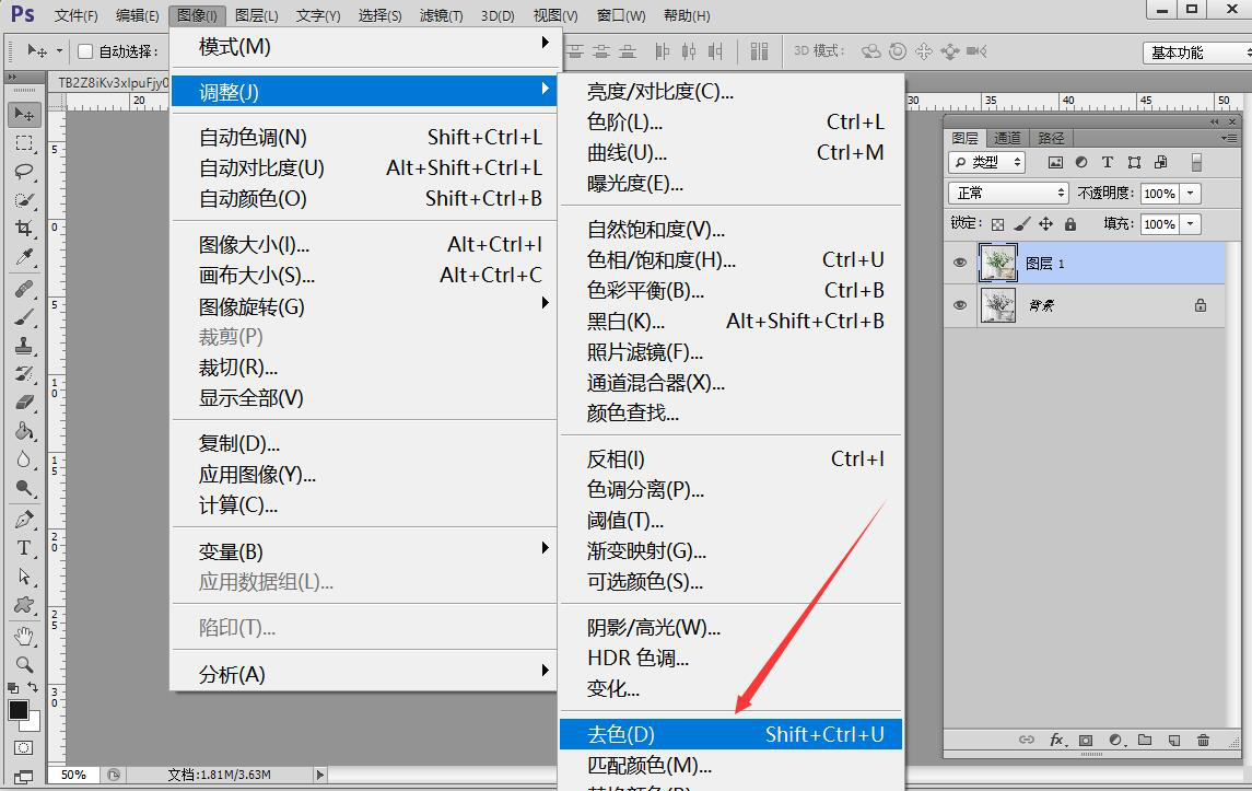 8. 除了上述两种方法,我们还可以点击”图像”菜单中的”调整”,并从其子菜单中点击”去色”。