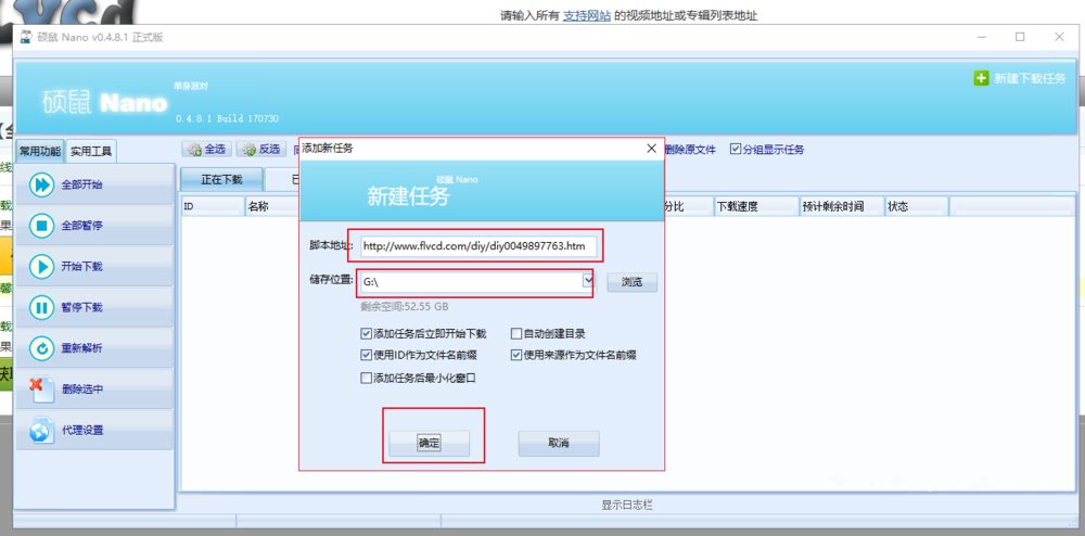 如图,在“添加新任务“面板中设置文件名称和储存位置,点击确定,即可开始下载视频,
