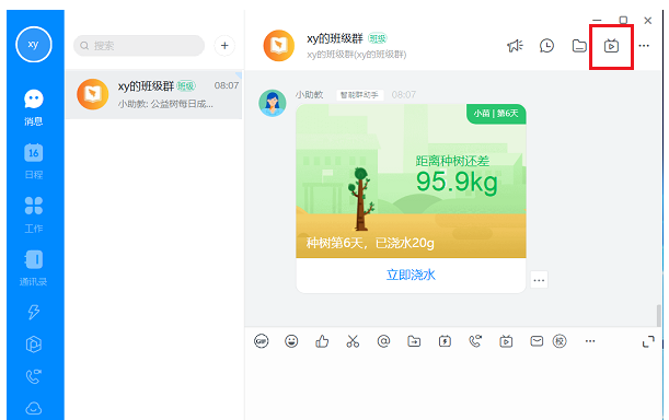 在电脑上打开钉钉,点击“消息“,进入一个群聊窗口,如图,点击上方的直播回放图标,