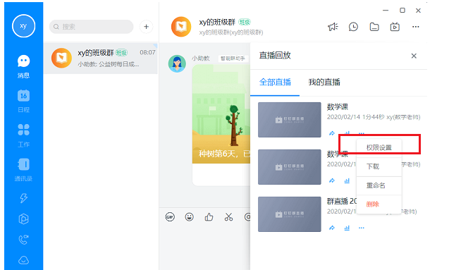 选择需要分享的直播视频,然后点击“...“,弹出菜单,点击“权限设置“,
