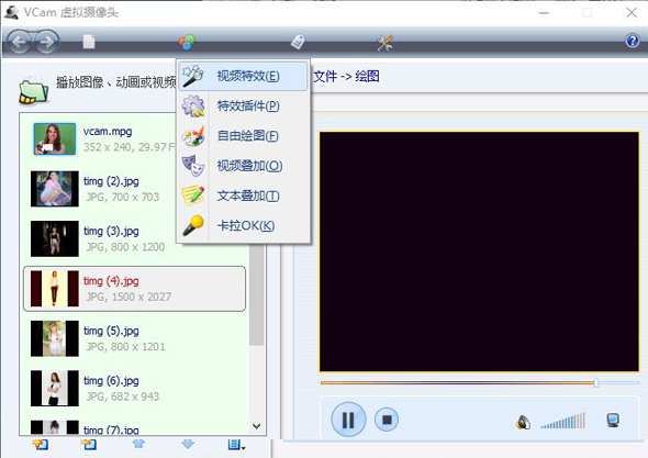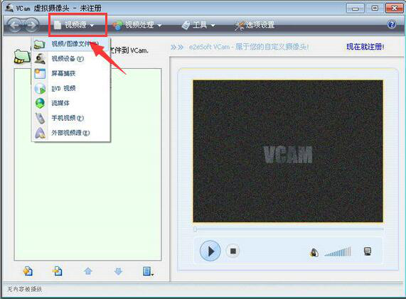 3. 接下来,用户点击 vcam 虚拟摄像头主界面左上方的“视频源”,在其下拉菜单中,点击“视频/图像文件”,将要和好友分享的文件添加进来。