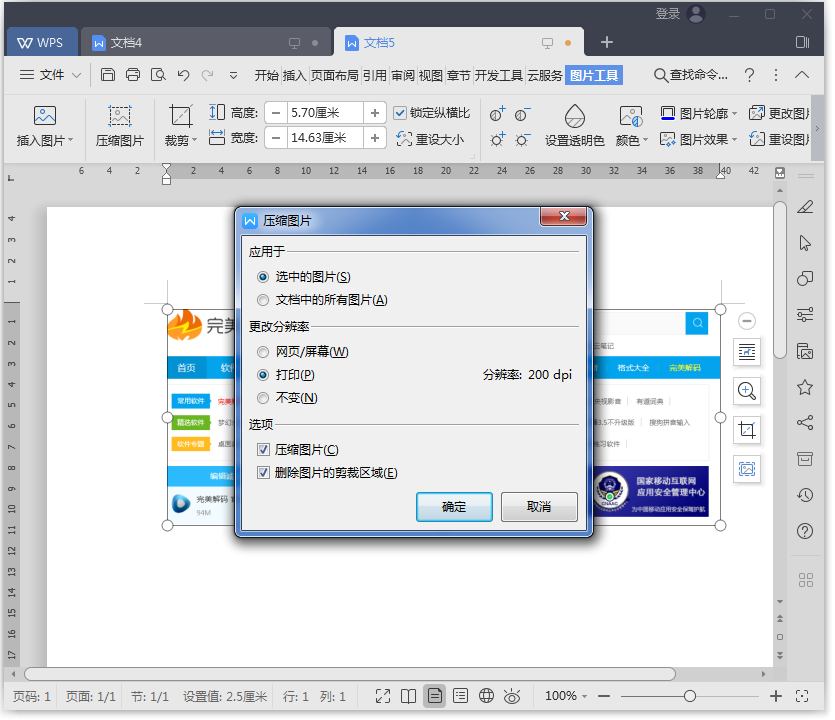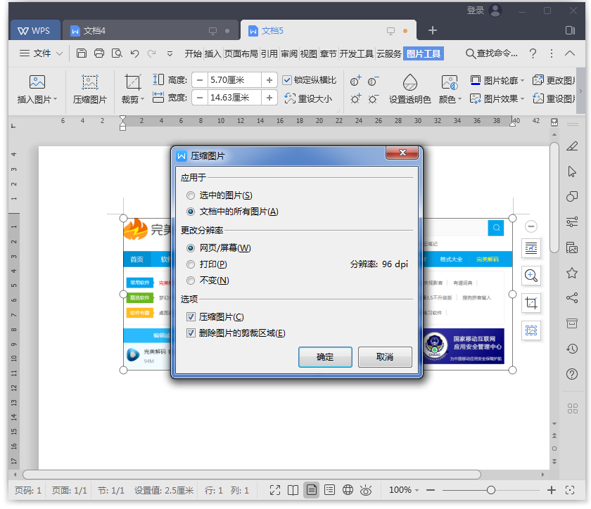 然后点击“更改分辨率”,这里有三种选项,大家根据实际情况进行选择,最后点击确定,软件即可自动压缩文档中的图片。