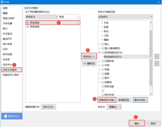 2. 然后,在选项窗口中切换至“自定义功能区“选项卡,并在右侧搜索出“拼音指南“,点击“新建选项卡“按钮,鼠标左键单击选中“拼音指南“,同时点击中部的“添加“按钮,再点击“确定“按钮。