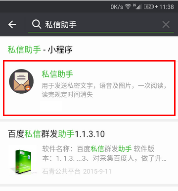 在搜索框中输入“私信助手”,然后点击进入结果中的“私信助手”小程序。