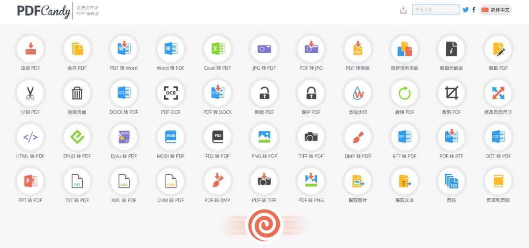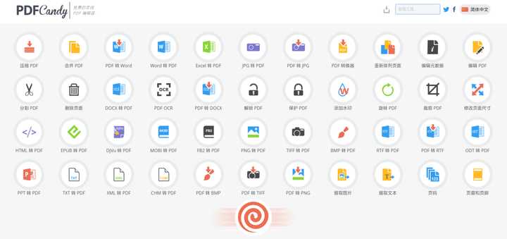 又是一款广受好评的 PDF 处理工具。国外网站,但支持中文。网站的 Logo 是一个螺旋形的“棒棒糖”,很有特色。目前包含了 50 多种和文档处理相关的功能,看着就非常有东西。
