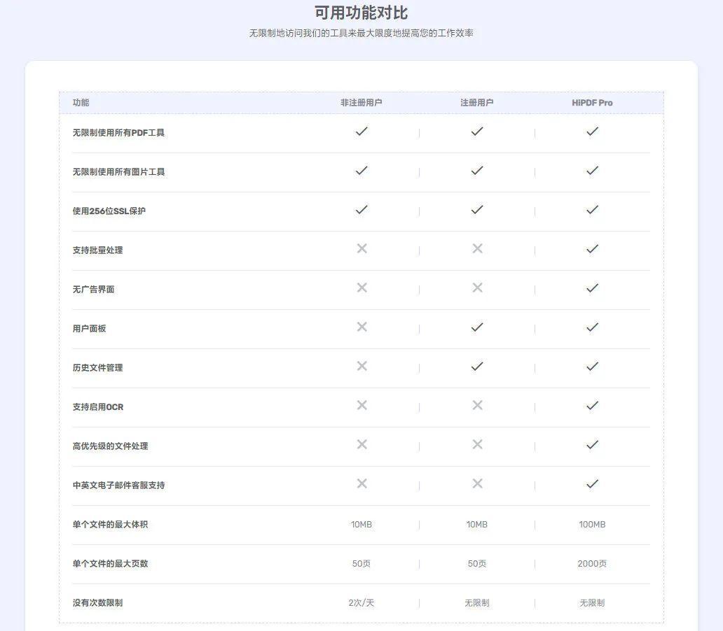 在文件处理量不大的情况下,HiPDF 会是一个比较好的选择,但不成为订阅用户的话有很多功能还是不那么自由的。从这份功能对比图来看,和前面几家“良心”相比,也差上了那么一点。