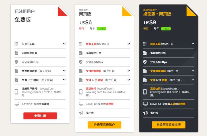 除了下载速度稍微有点慢(可能是服务器地域原因),其他地方的功能做得基本都无可挑剔。交互性强,直观简洁。最重要的是:它是一个几乎无注册会员限制的工具。iLovePDF 也有付费会员服务,但你使用它进行文件处理,无需注册、登录,而付费注册也仅仅是提高了文件数量限制和和尺寸大小限制。