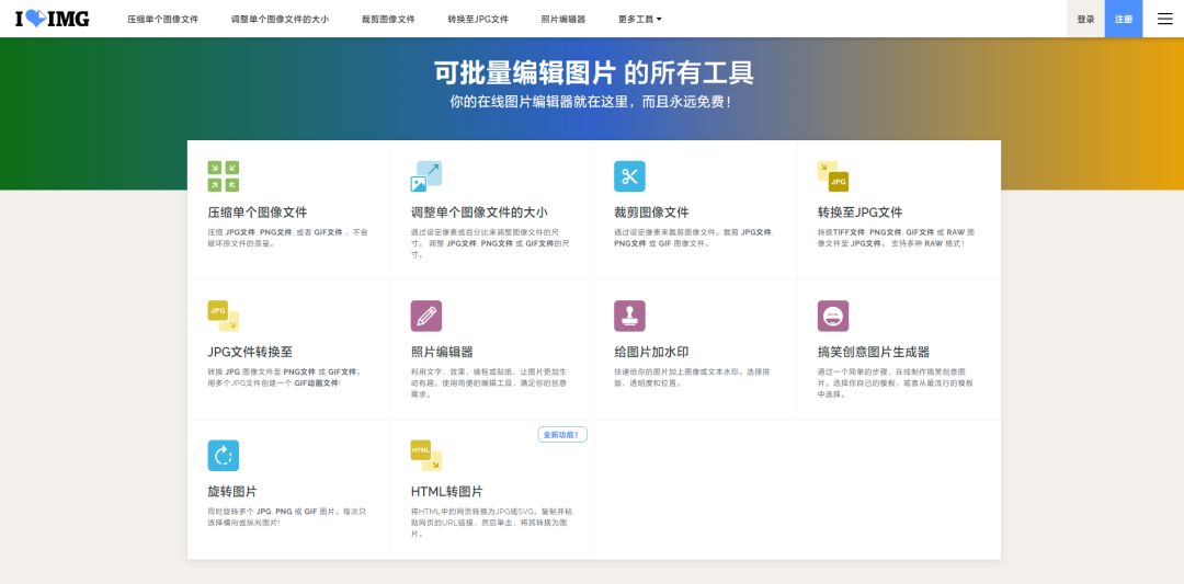 iLovePDF 还有一个兄弟站,是专门处理图片的,叫 iLoveIMG (我爱图片),功能也特别全面。如果你想靠最少的网站数量解决最多的需求,收藏这两个网站能帮你搞定绝大多数图片文档处理工作。
