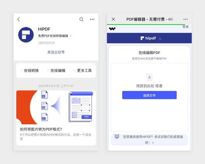 如果要说 HiPDF 有什么特点,那大概是它的移动端功能了。请关注 HiPDF 的公号,在菜单里可以直接找到 PD F的转换、编辑功能,点击以后跳转到移动端页面。如果你常常出门在外,有这样一个移动的 PDF 处理器还是非常方便的。