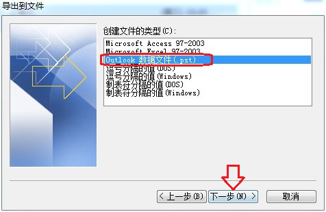 4. 弹出“导出到文件”窗口,在右侧“创建文件的类型”列表中选择” Outlook 数据文件”,然后点击”下一步”。