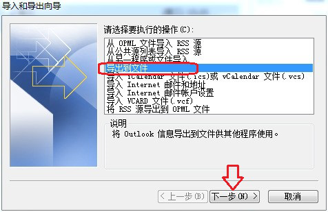 3. 弹出“导入和导出向导”窗口,在右侧“请选择要执行的操作”列表中选择”导出到文件”,然后点击”下一步”。